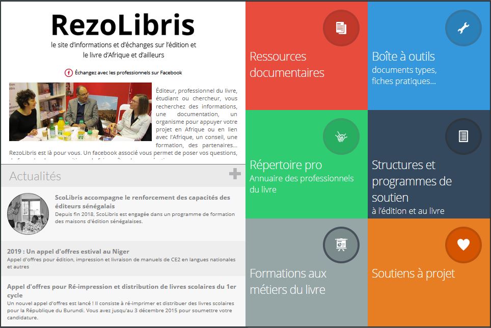 ScoLibris a créé en 2016 RezoLibris. Cette plate-forme est destinée à contribuer à donner plus de visibilité aux livres et aux professionnel.le.s du livre africain.e.s, mais aussi à appuyer les professionnel.le.s en leur donnant accès à des outils qui ont fait leur preuve (fichier pour calculer un seul de rentabilité, etc.)